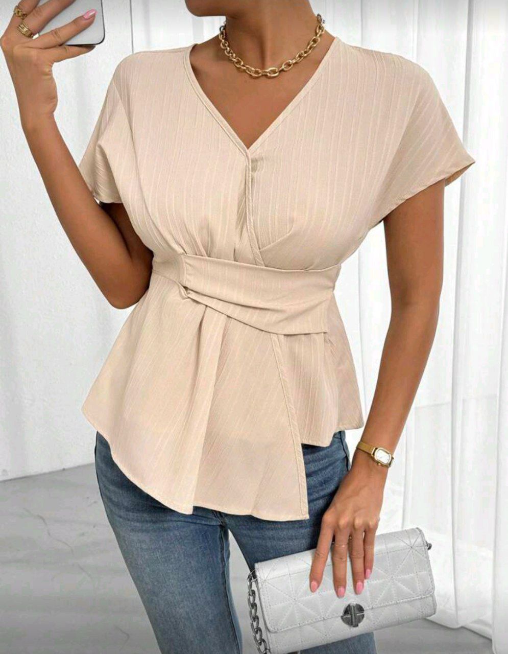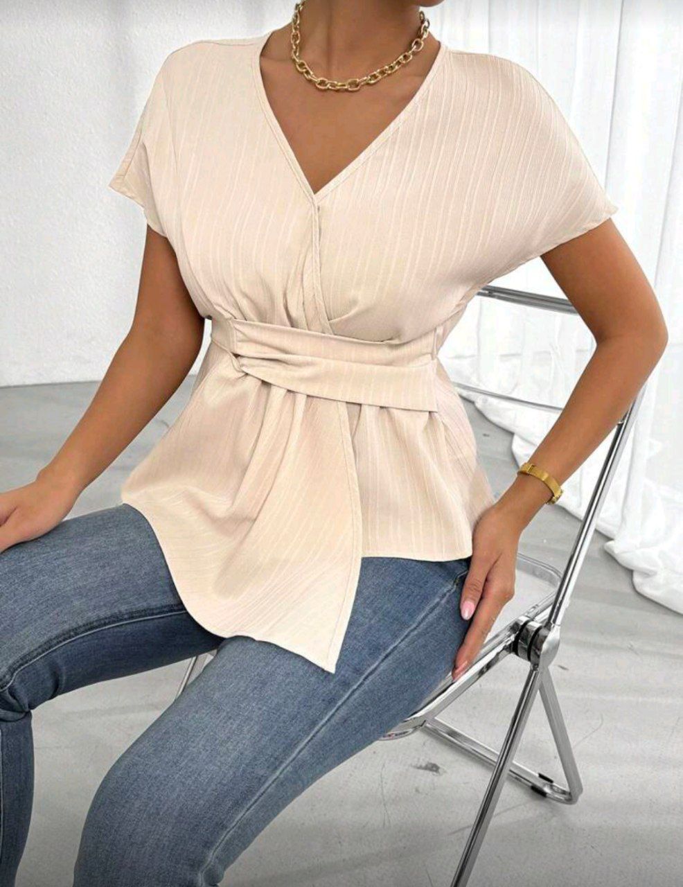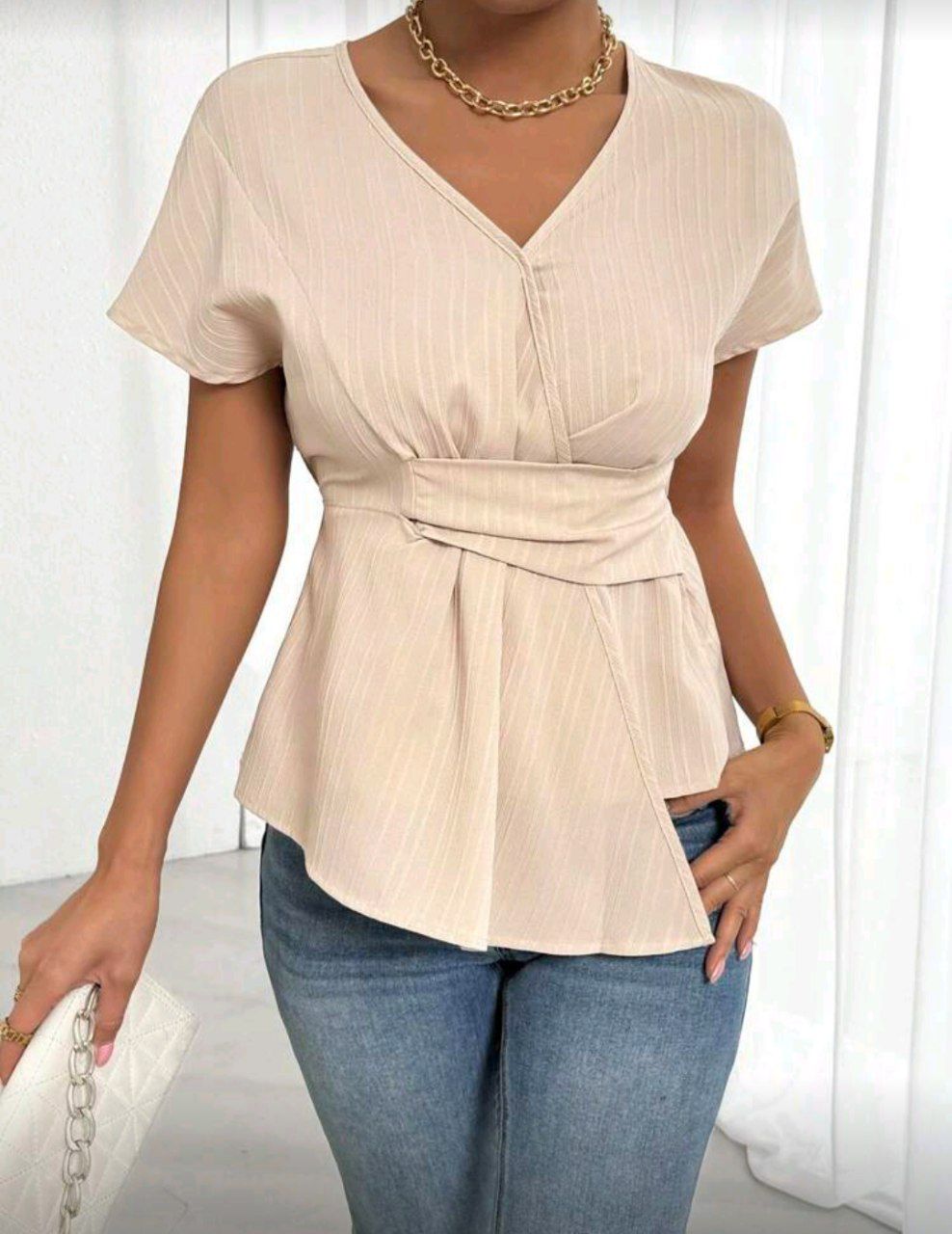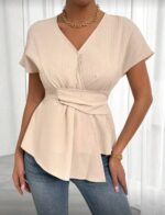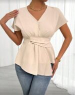 Chiquease بلوزة نسائية برقبة V قصيرة المدة بلون سادة