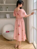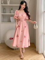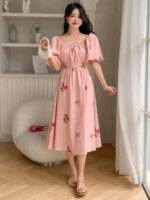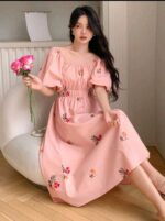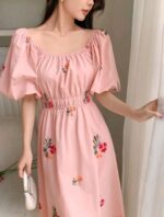 DAZY فستان صيفي بطباعة زهور، يحيط الرقبة بمربع، أكمام منتفخة، خصر مكتنز