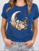 INAWLY تي شيرت صيفي قصير الأكمام بطبعة القمر والزهور وياقة مستديرة، تيشيرت كاجوال مطبوع للنساء
