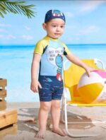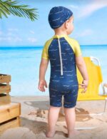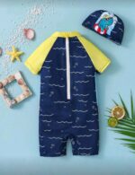 SHEIN طفل رضيع الكرتون نمط الديناصور الصغير قصيرة الأكمام الوقوف طوق ملابس السباحة قطعة واحدة مع مجموعة قبعة