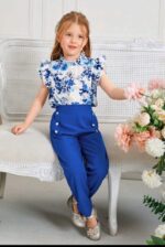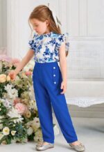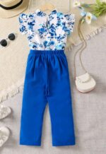 SHEIN مجموعة قميص وبنطلون بناتي مطبوع بزهور مع حواف بفتحات