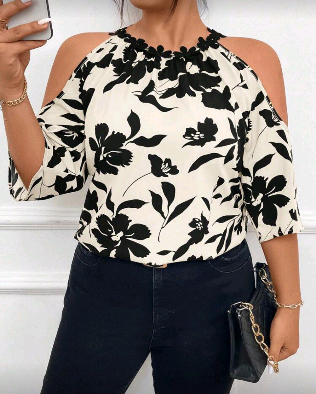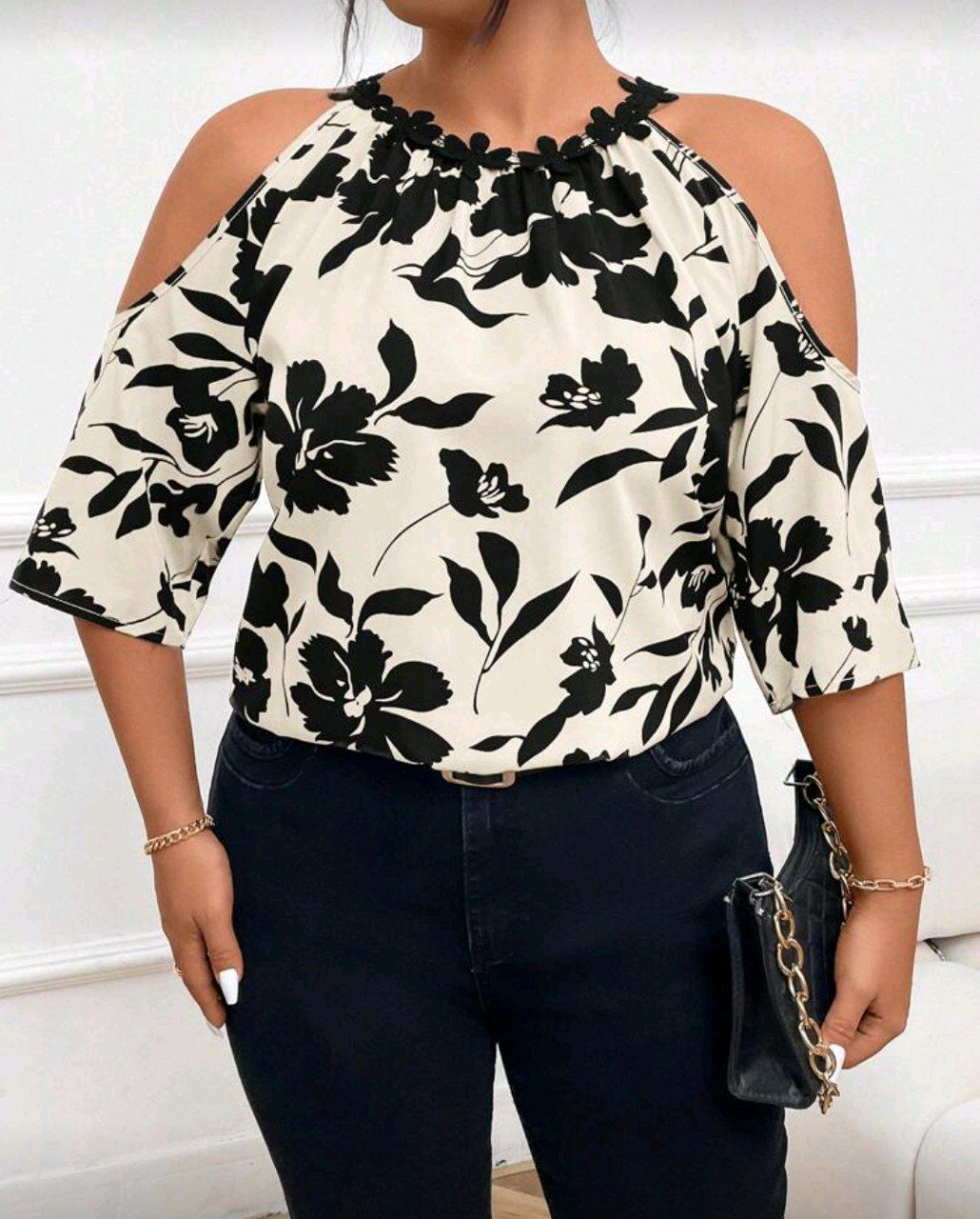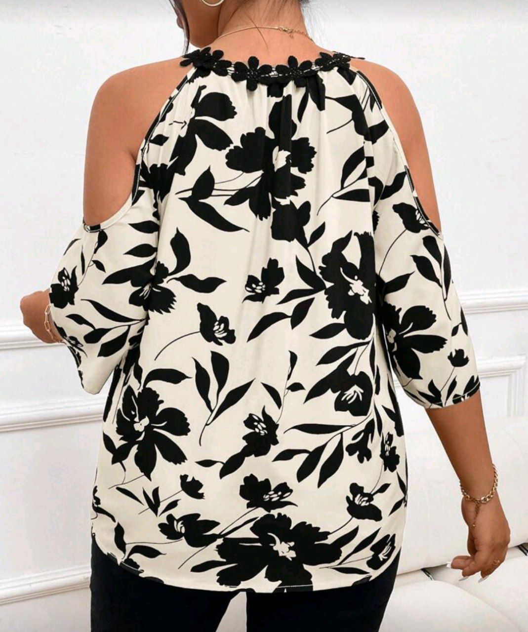 SHEIN LUNE بلوزة ياقة مفتوح تفاصيل ازرار منخفض الاكتاف