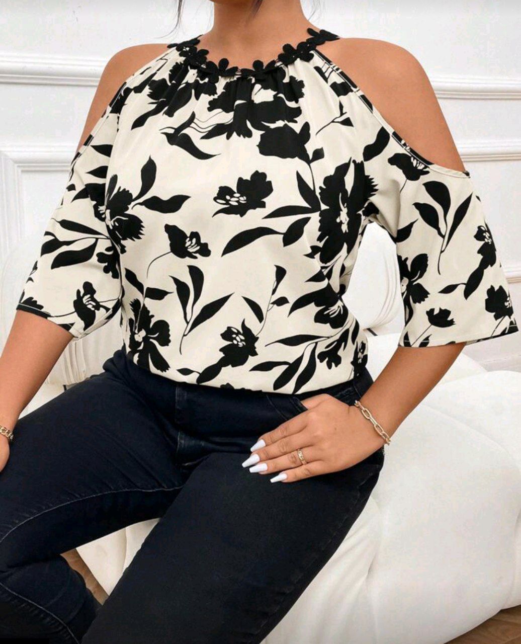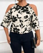 SHEIN Frenchy قميص حرير بطبعة زهرية للأكتاف للنساء مقاسات كبيرة، مناسب للصيف