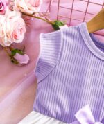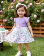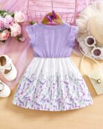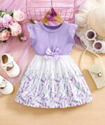 SHEIN Vintaside Kids فستان قطعة واحدة للبنت الصغيرة من الحرير بطبعة زهرية وأكمام قصيرة برقبة كشكش بنفسجي وأبيض مريح وعادي، مناسب لرحلات الصيف والخارج